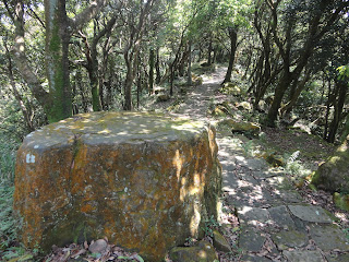 The moss-covered rocks weren't so bad going up. Walking back towards the pavilion, I took the other way in the fork, wondering if there was a higher part of the peak...nope, just trails leading away to other mountains. So that pavilion really was at the highest part of Dajian...I decided to take a picture of it, and of the trail leading back towards it.